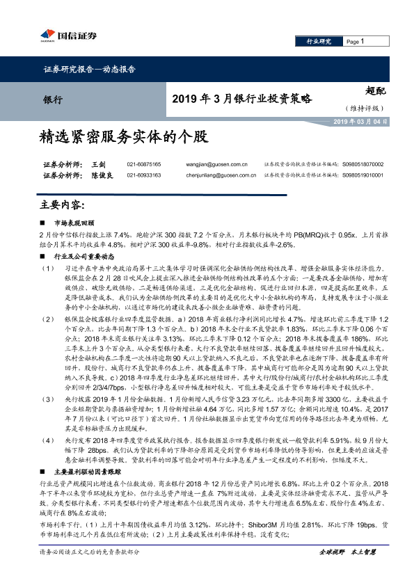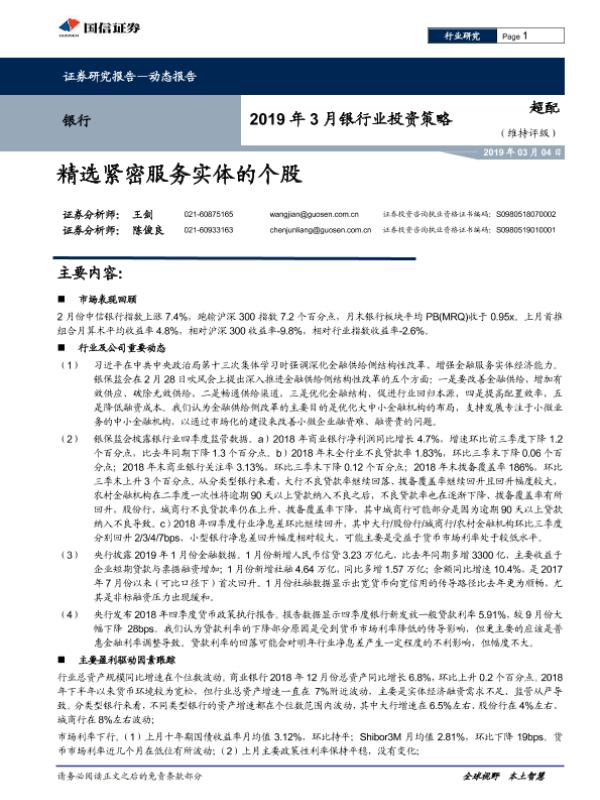 【国信证券】【20190304】2019年3月银行业投资策略:精选紧密服务实体的个股-8页
