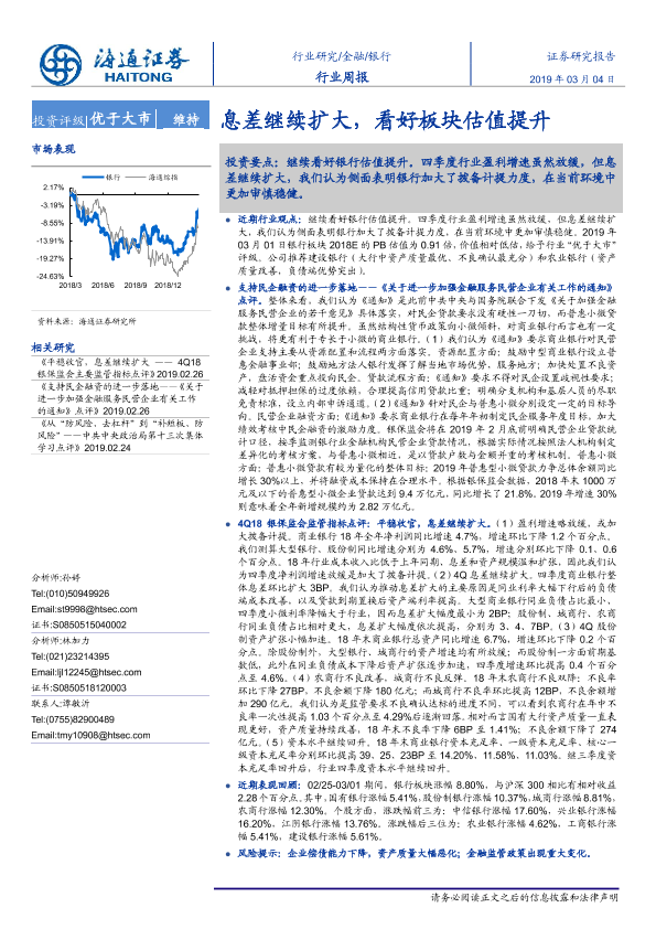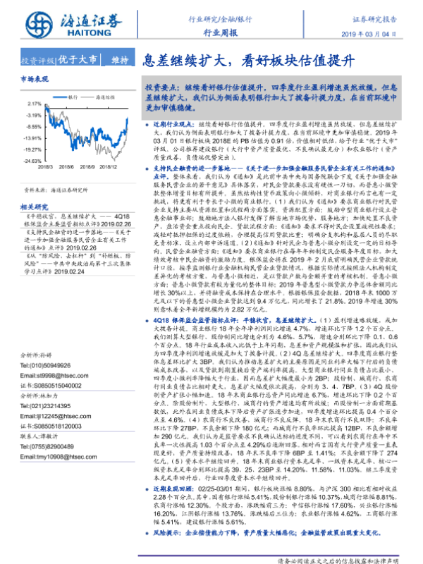 【海通证券】【20190304】银行行业周报:息差继续扩大,看好板块估值提升-9页