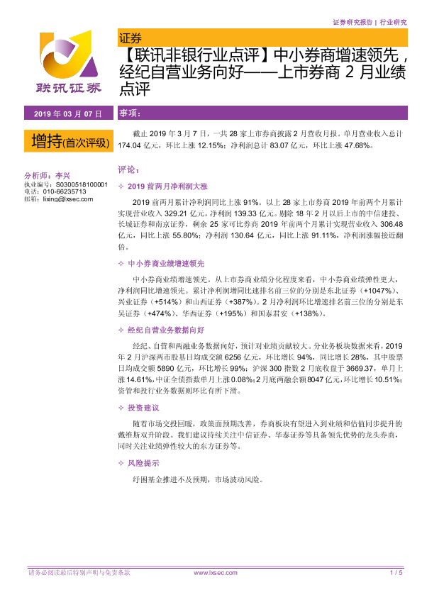 【粤开证券】【20190307】中小券商增速领先,经纪自营业务向好——上市券商2月业绩点评-5页
