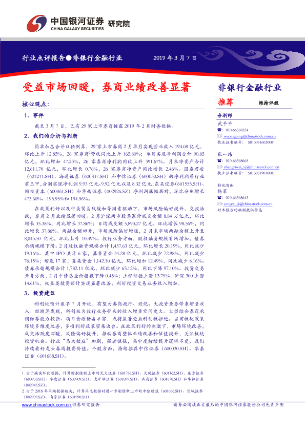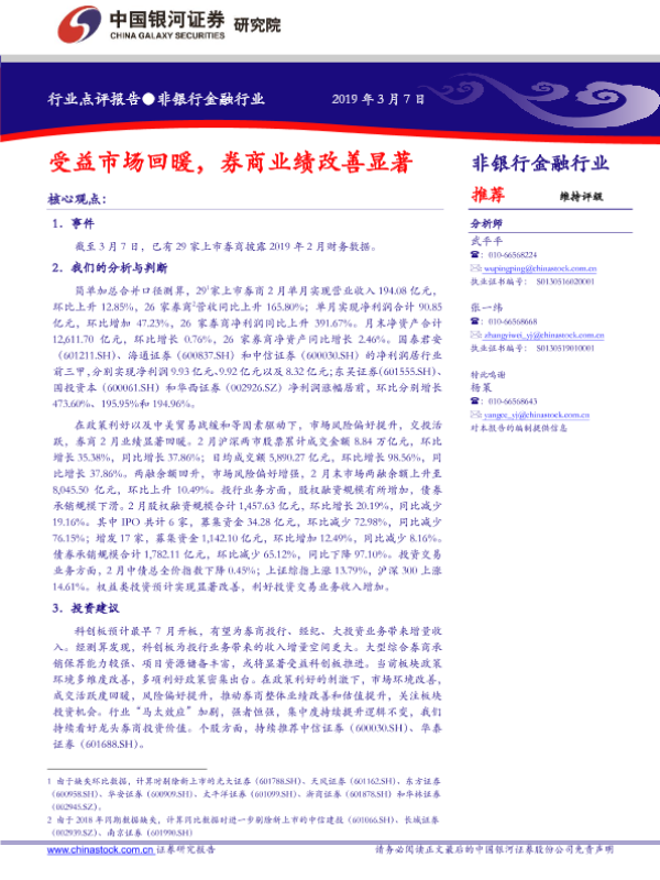 【银河证券】【20190307】非银行金融行业:受益市场回暖,券商业绩改善显著-4页