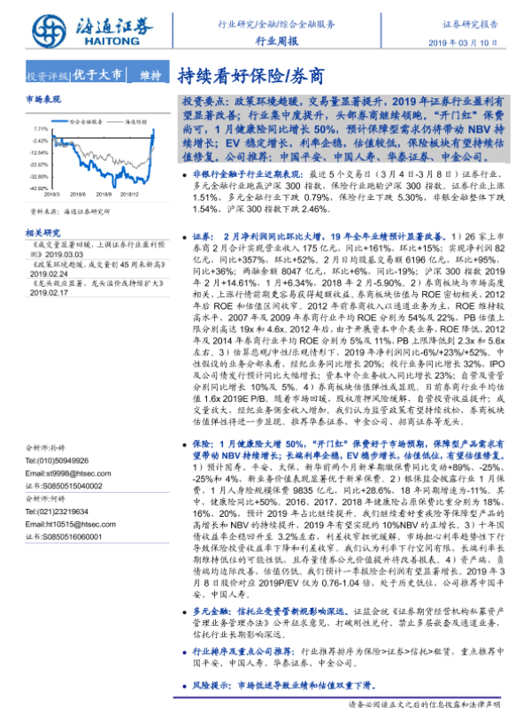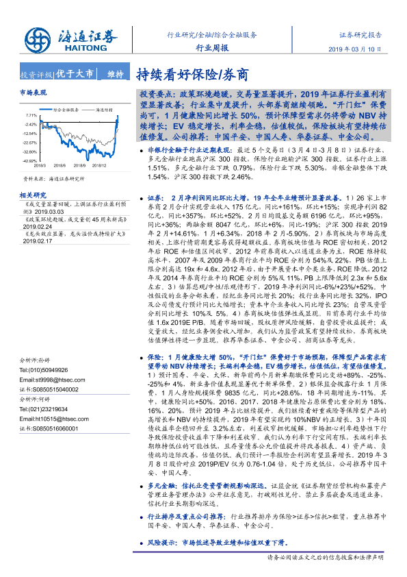 【海通证券】【20190310】综合金融服务行业周报:持续看好保险 券商-19页