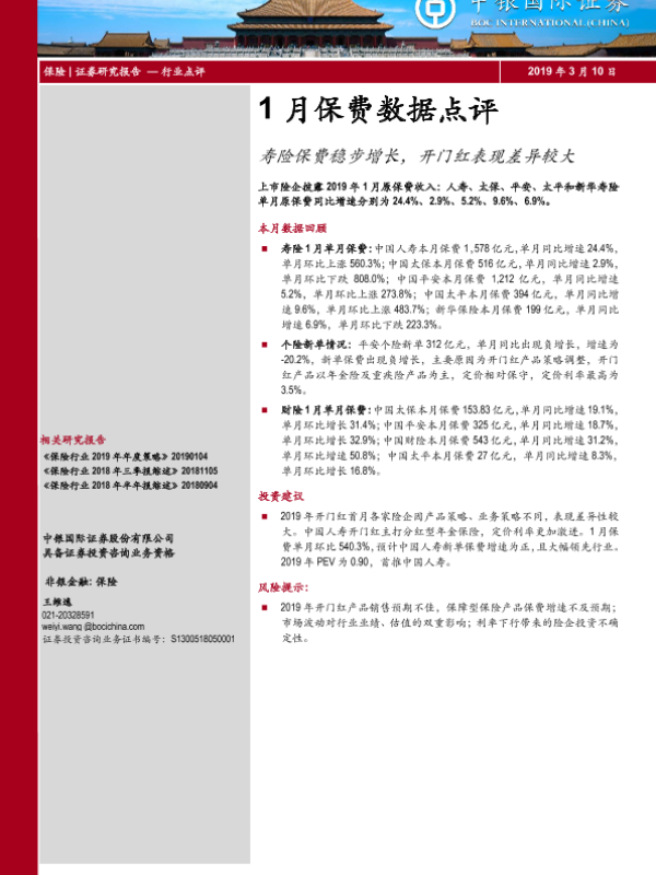 【中银证券】【20190310】1月保费数据点评:寿险保费稳步增长,开门红表现差异较大-6页