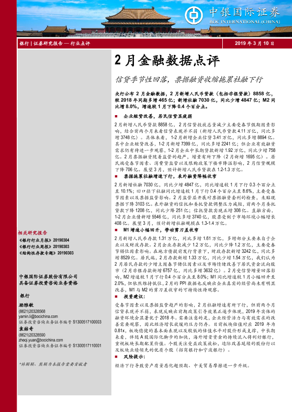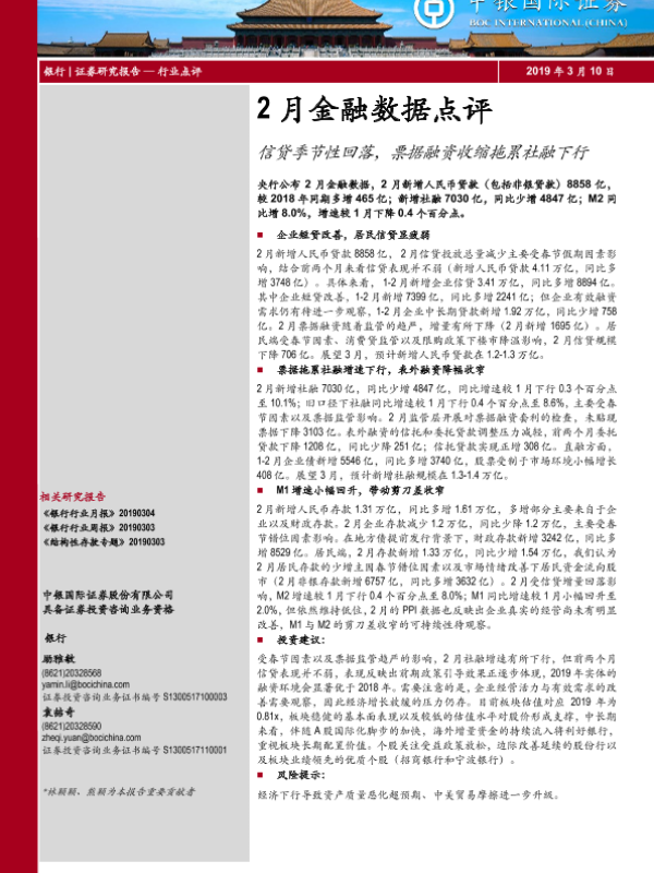 【中银证券】【20190310】2月金融数据点评:信贷季节性回落,票据融资收缩拖累社融下行-7页