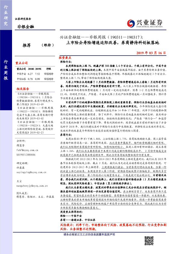 【兴业证券】【20190316】非银周报:上市险企寿险增速边际改善,券商静待科创板落地-10页