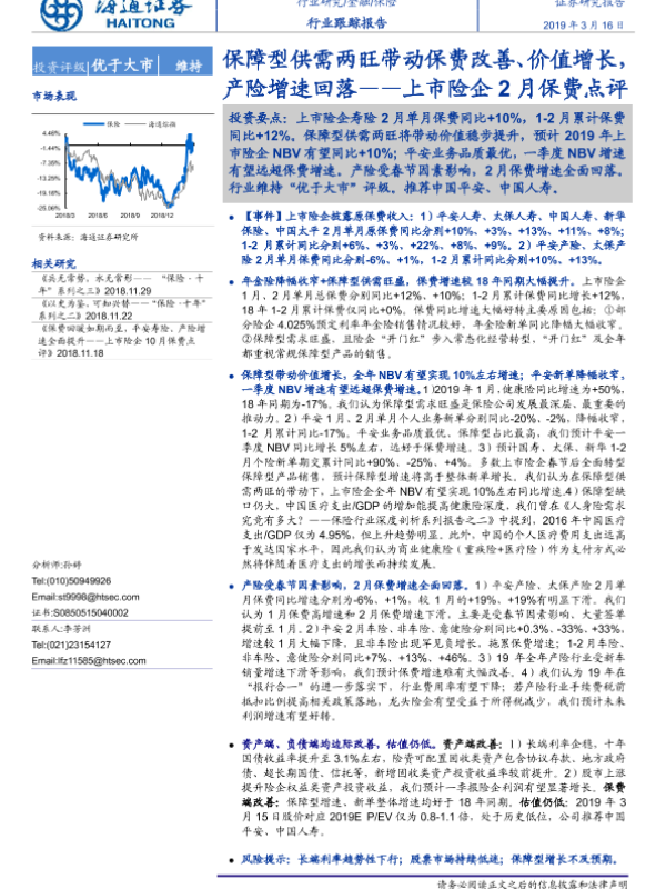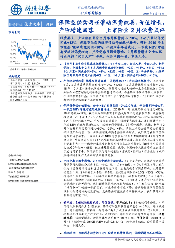 【海通证券】【20190316】上市险企2月保费点评:保障型供需两旺带动保费改善、价值增长,产险增速回落-5页