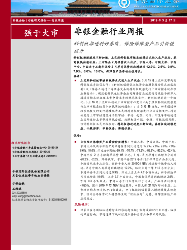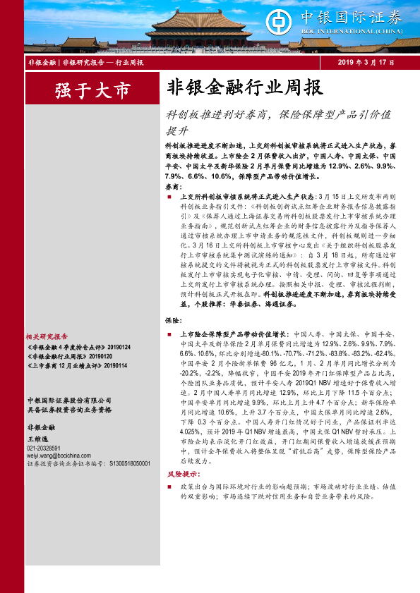 【中银证券】【20190317】非银金融行业周报:科创板推进利好券商,保险保障型产品引价值提升-12页