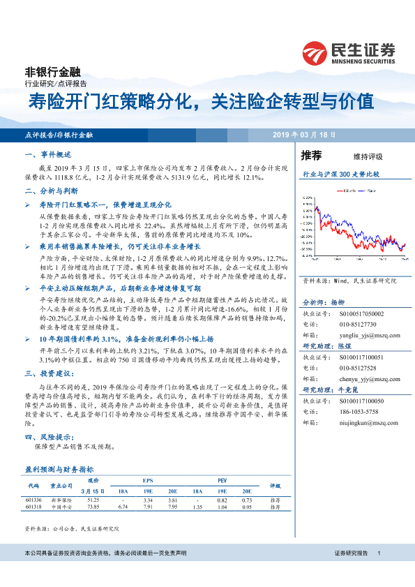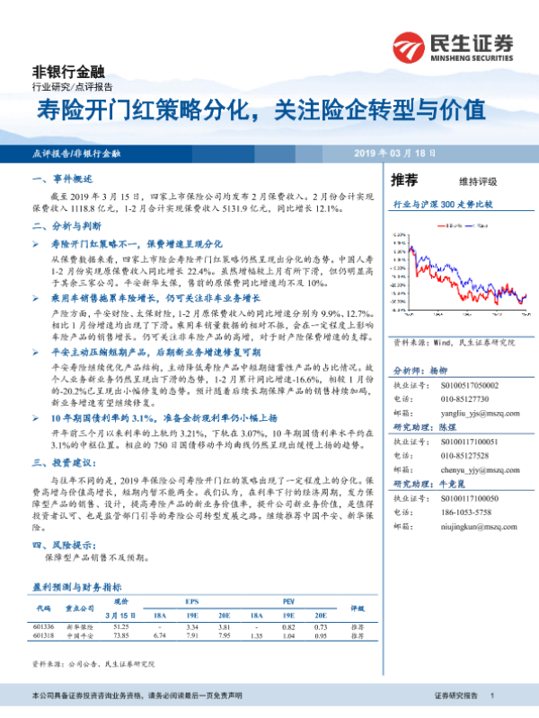 【民生证券】【20190318】非银行金融行业研究:寿险开门红策略分化,关注险企转型与价值-5页
