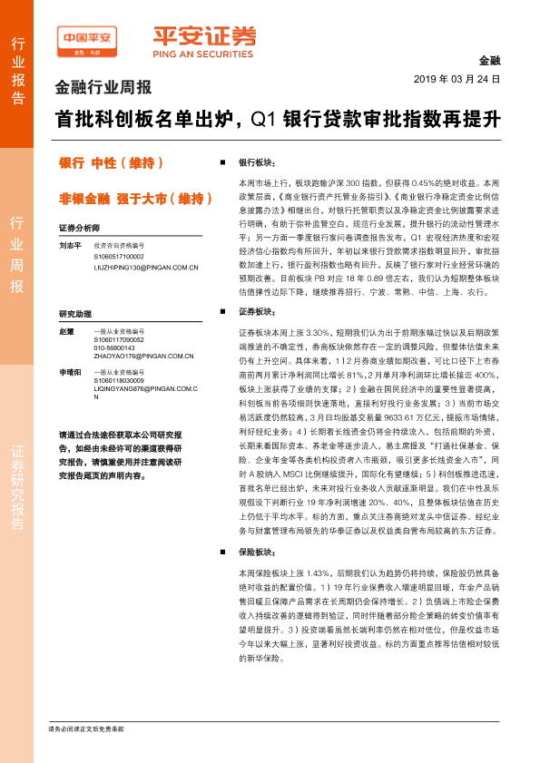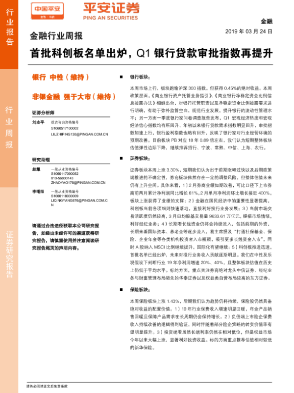 【平安证券】【20190324】金融行业周报:首批科创板名单出炉,Q1银行贷款审批指数再提升-10页