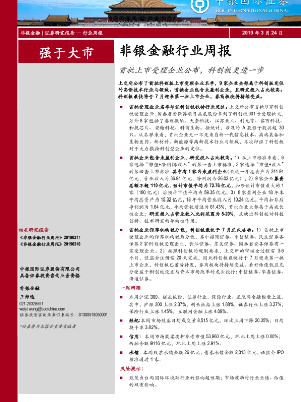 【中银证券】【20190324】非银金融行业周报:首批上市受理企业公布,科创板更进一步-13页