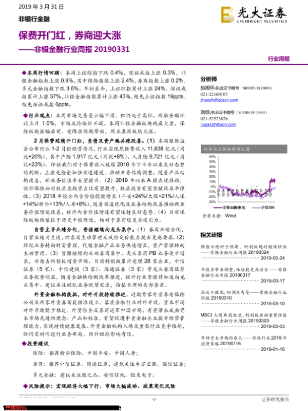 【光大证券】【20190331】非银金融行业周报:保费开门红,券商迎大涨-15页