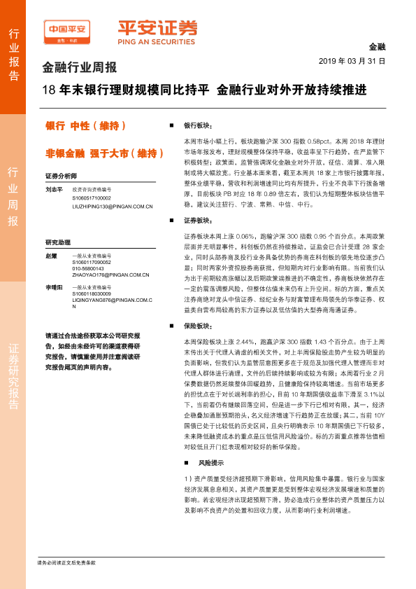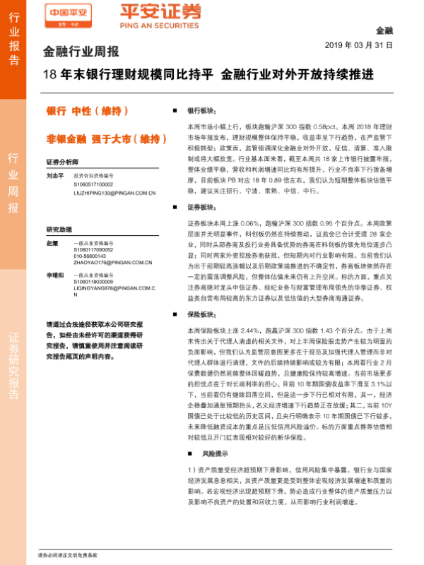 【平安证券】【20190331】金融行业周报:18年末银行理财规模同比持平 金融行业对外开放持续推进-11页