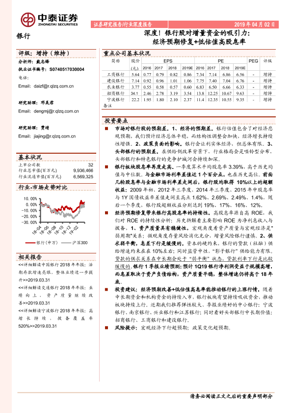 【中泰证券】【20190402】银行行业深度报告:深度!银行股对增量资金的吸引力:经济预期修复+低估值高股息率-18页