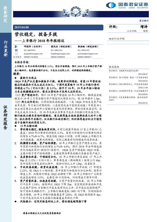 【国泰君安证券】【20190408】上市银行2018年年报综述:营收稳定,拨备多提-23页