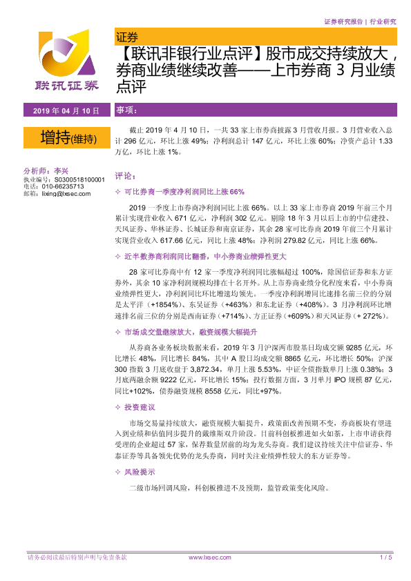 【粤开证券】【20190410】上市券商3月业绩点评:股市成交持续放大,券商业绩继续改善-5页