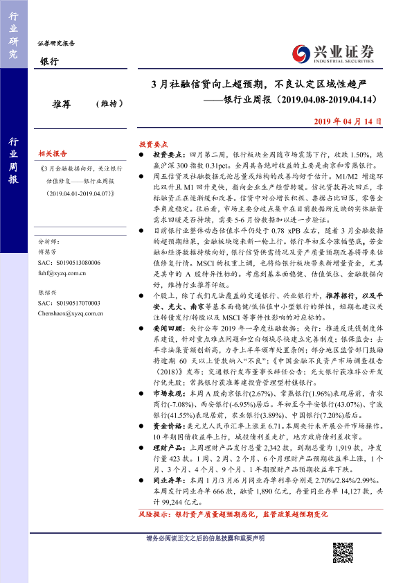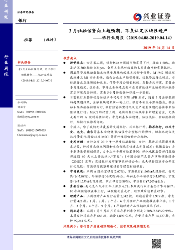 【兴业证券】【20190414】3月社融信贷向上超预期,不良认定区域性趋严-11页
