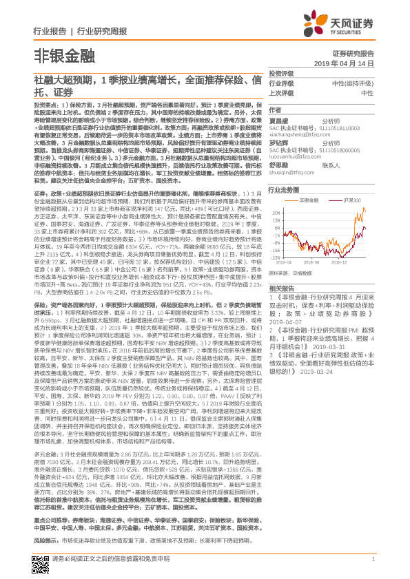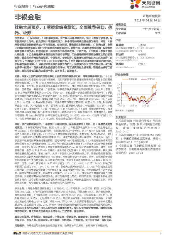 【天风证券】【20190414】非银金融行业研究周报:社融大超预期,1季报业绩高增长,全面推荐保险、信托、证券-9页