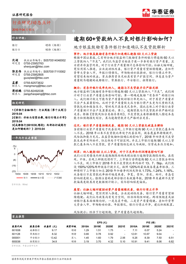 【华泰证券】【20190415】地方银监鼓励有条件银行加速确认不良贷款解析:逾期60+贷款纳入不良对银行影响如何?-8页