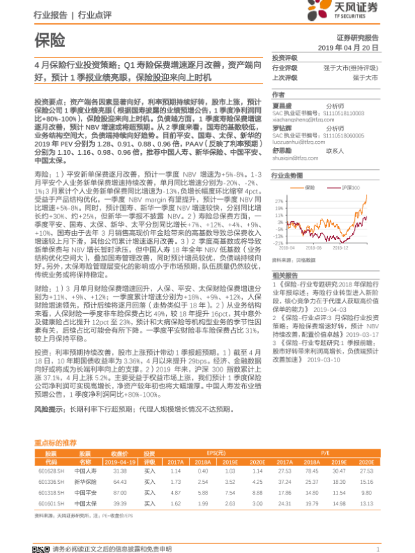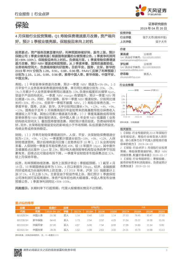 【天风证券】【20190420】4月保险行业投资策略:Q1寿险保费增速逐月改善,资产端向好,预计1季报业绩亮眼,保险股迎来向上时机-7页