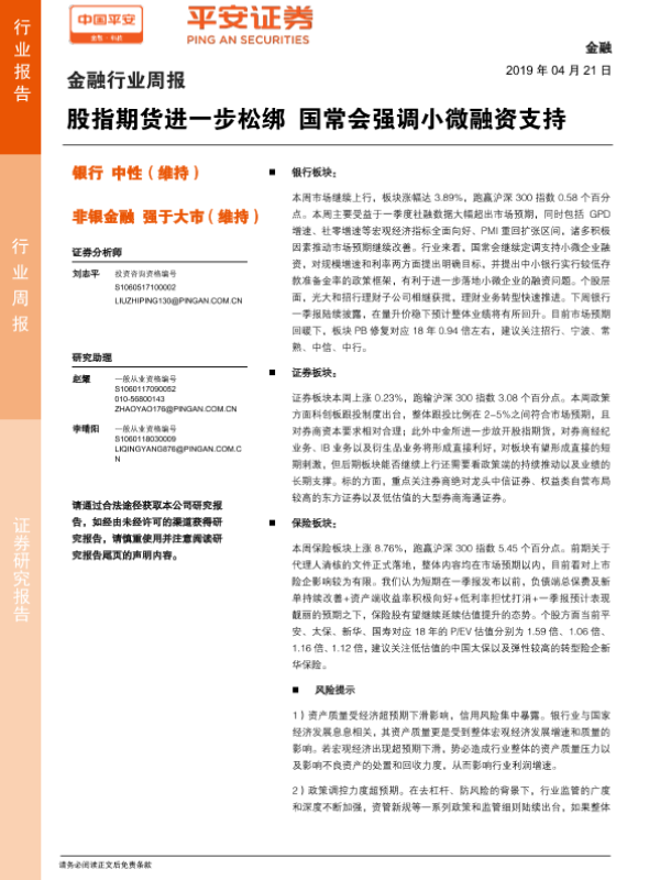 【平安证券】【20190421】金融行业周报:股指期货进一步松绑 国常会强调小微融资支持-11页