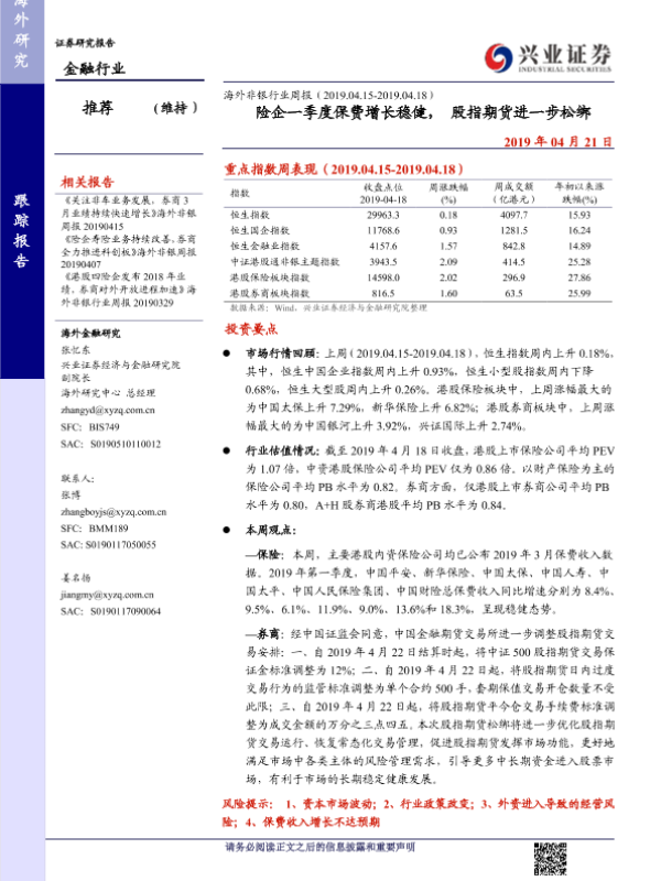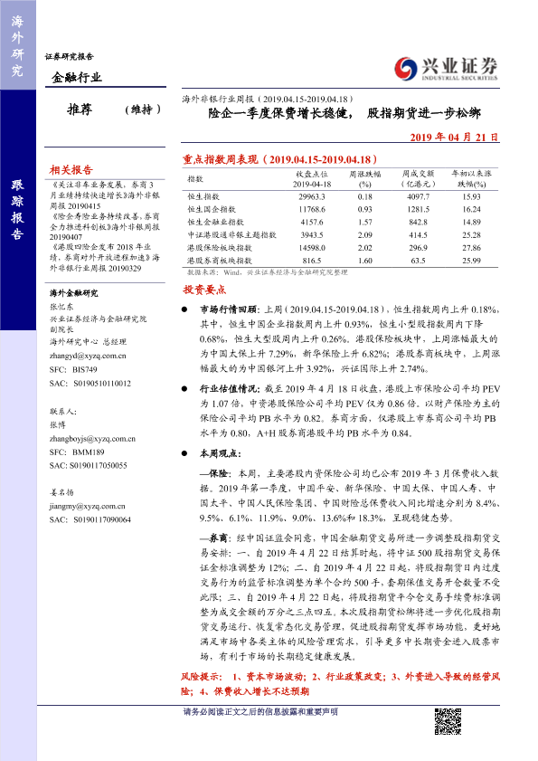【兴业证券】【20190421】海外非银行业周报:险企一季度保费增长稳健,股指期货进一步松绑-19页