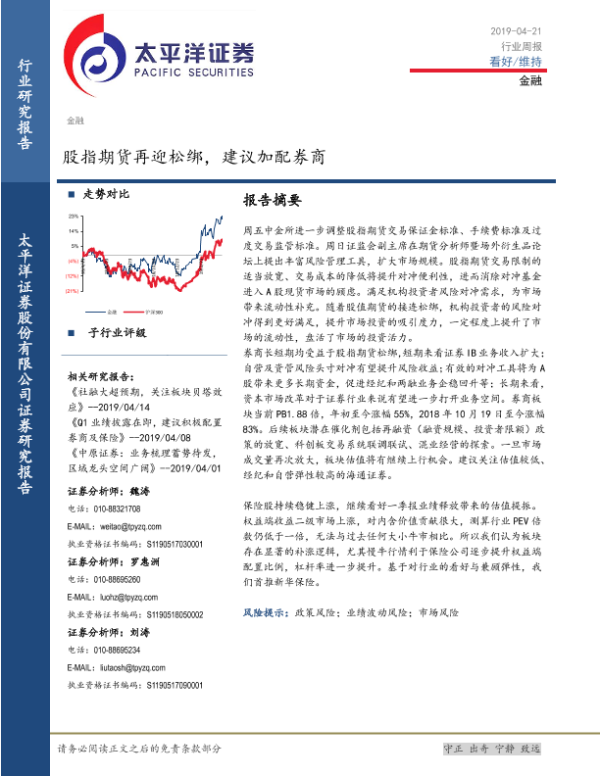 【太平洋证券】【20190421】金融行业周报:股指期货再迎松绑,建议加配券商-13页