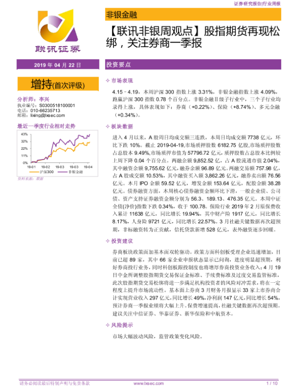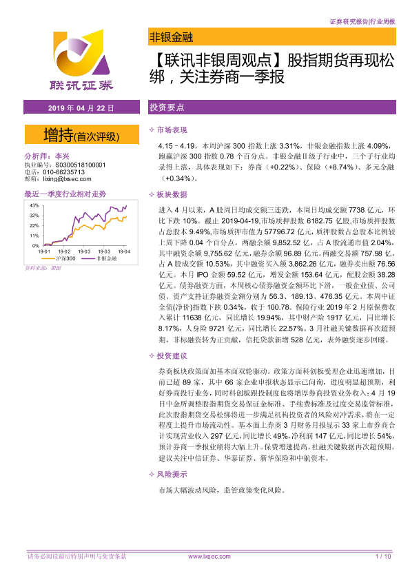 【粤开证券】【20190422】联讯非银周观点:股指期货再现松绑,关注券商一季报-10页