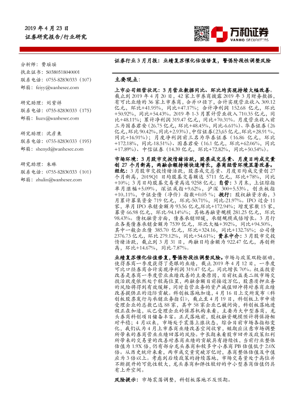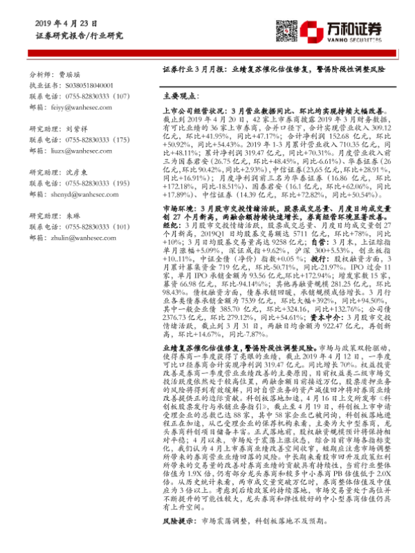 【万和证券】【20190423】证券行业3月月报:业绩复苏催化估值修复,警惕阶段性调整风险-15页