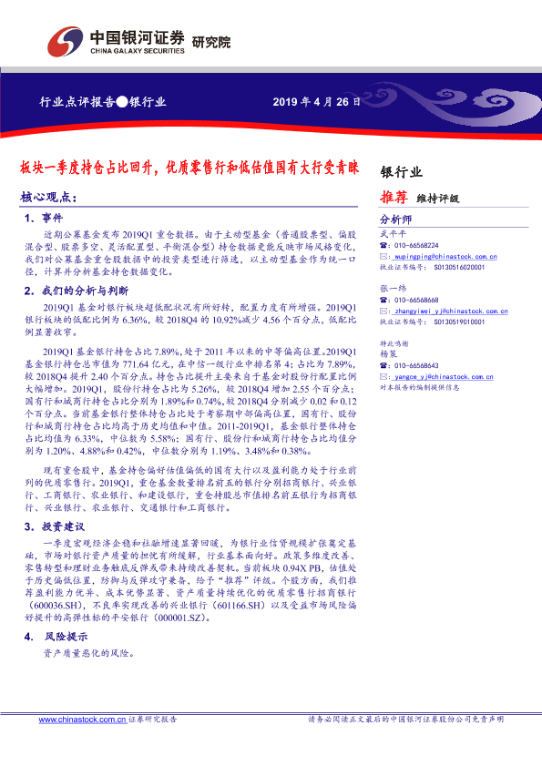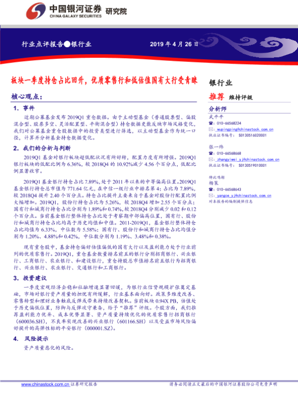 【银河证券】【20190426】板块一季度持仓占比回升,优质零售行和低估值国有大行受青睐-8页