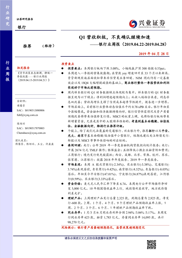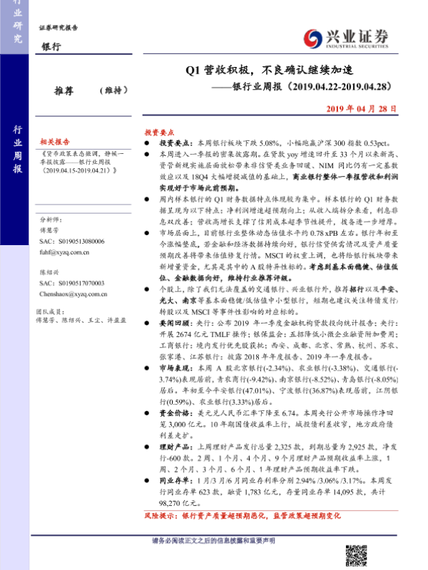 一季报 不良确认 估值水平 营收分析 银行业