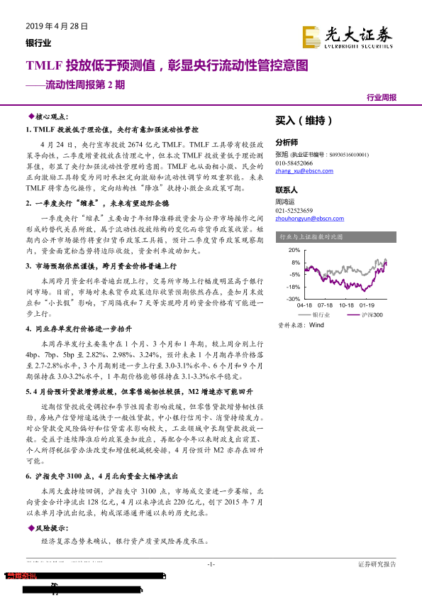 【光大证券】【20190428】银行业流动性周报第2期:TMLF投放低于预测值,彰显央行流动性管控意图-9页