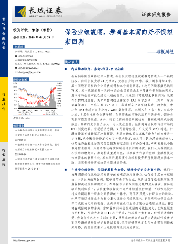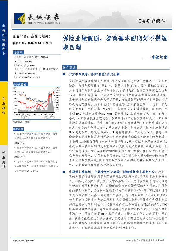 【长城证券】【20190428】非银周报:保险业绩靓丽,券商基本面向好不惧短期回调-36页
