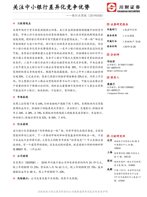 【川财证券】【20190428】银行业周报:关注中小银行差异化竞争优势-12页