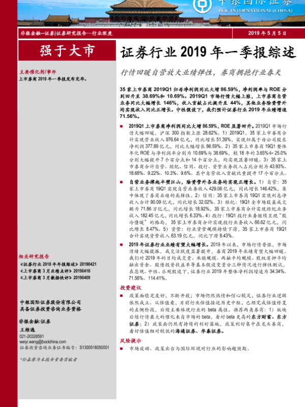 【中银证券】【20190505】证券行业2019年一季报综述:行情回暖自营放大业绩弹性,券商拥抱行业春天-26页