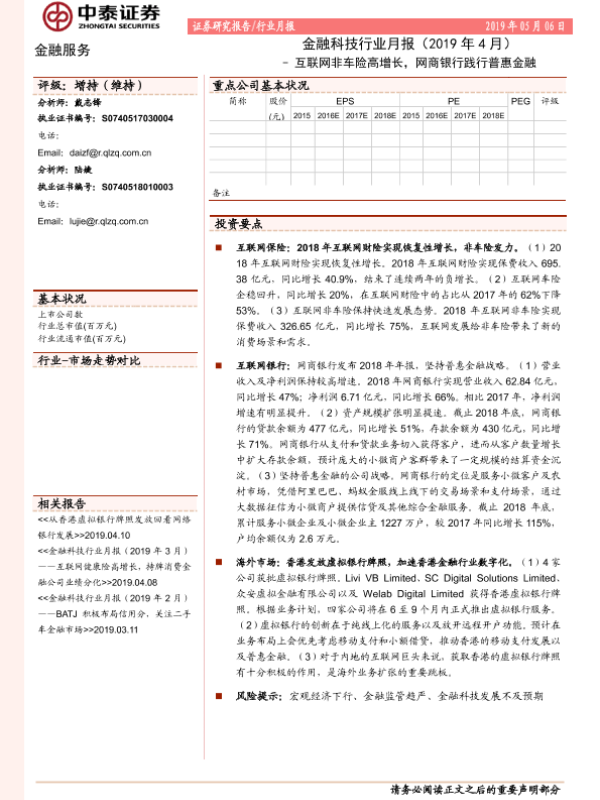 【中泰证券】【20190506】金融科技行业月报:互联网非车险高增长,网商银行践行普惠金融-16页
