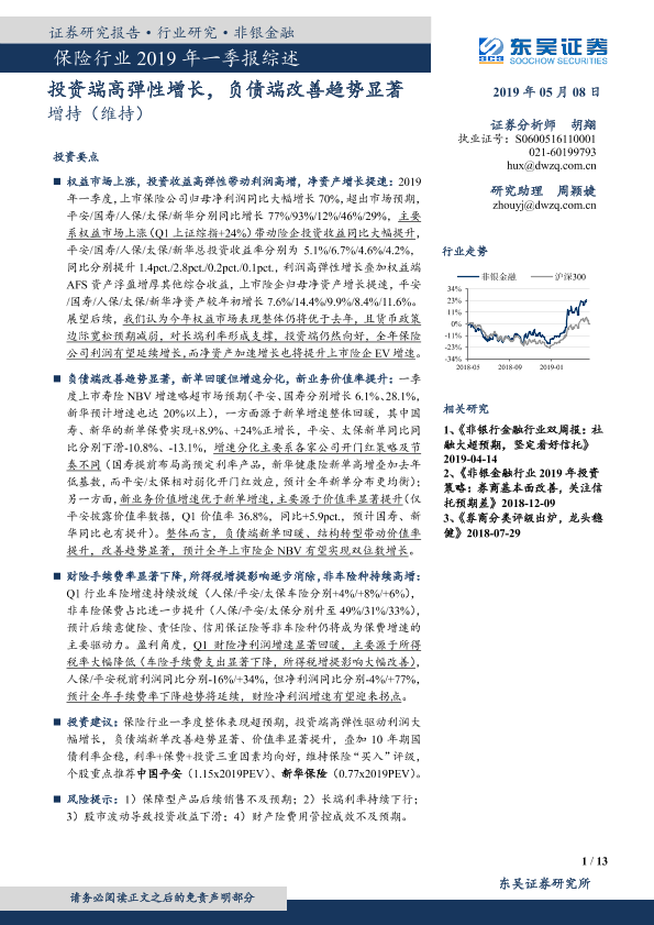 【东吴证券】【20190508】保险行业2019年一季报综述:投资端高弹性增长,负债端改善趋势显著-13页