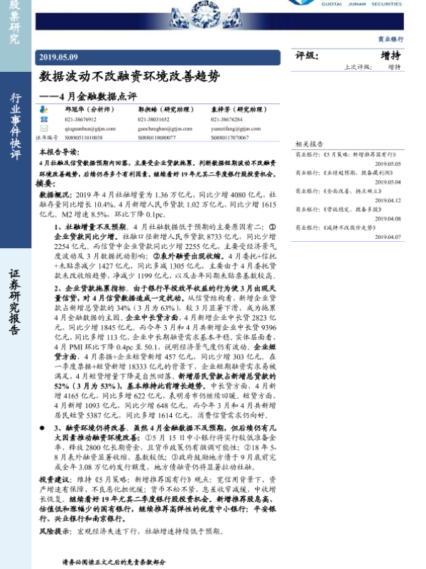 【国泰君安证券】【20190509】4月金融数据点评:数据波动不改融资环境改善趋势-5页