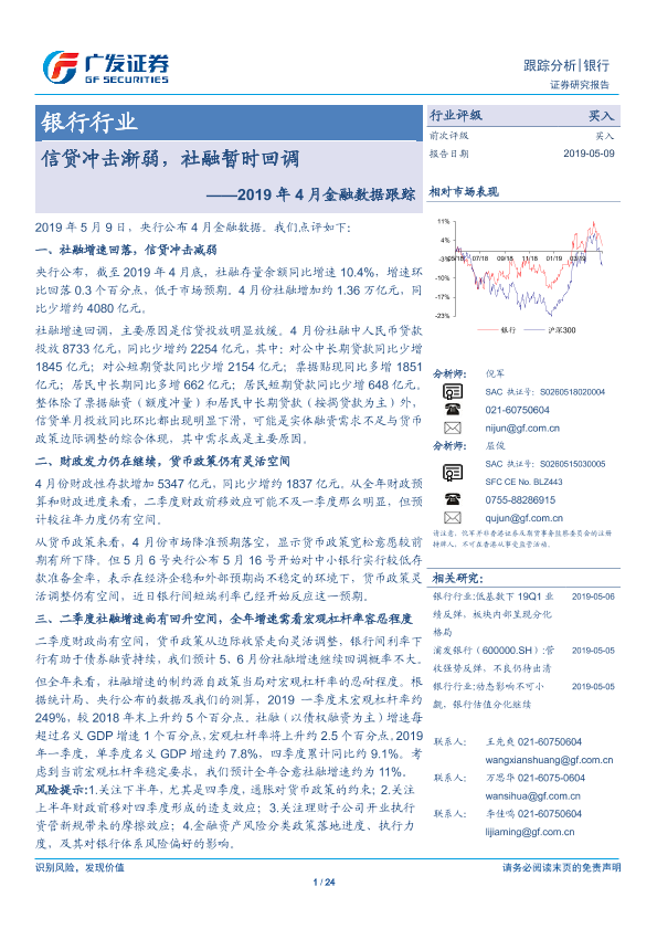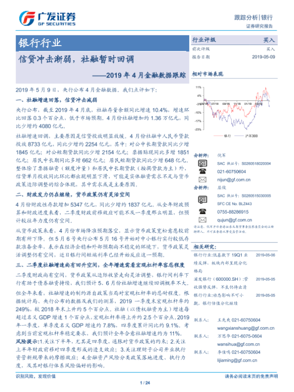 【广发证券】【20190509】银行行业2019年4月金融数据跟踪:信贷冲击渐弱,社融暂时回调-24页