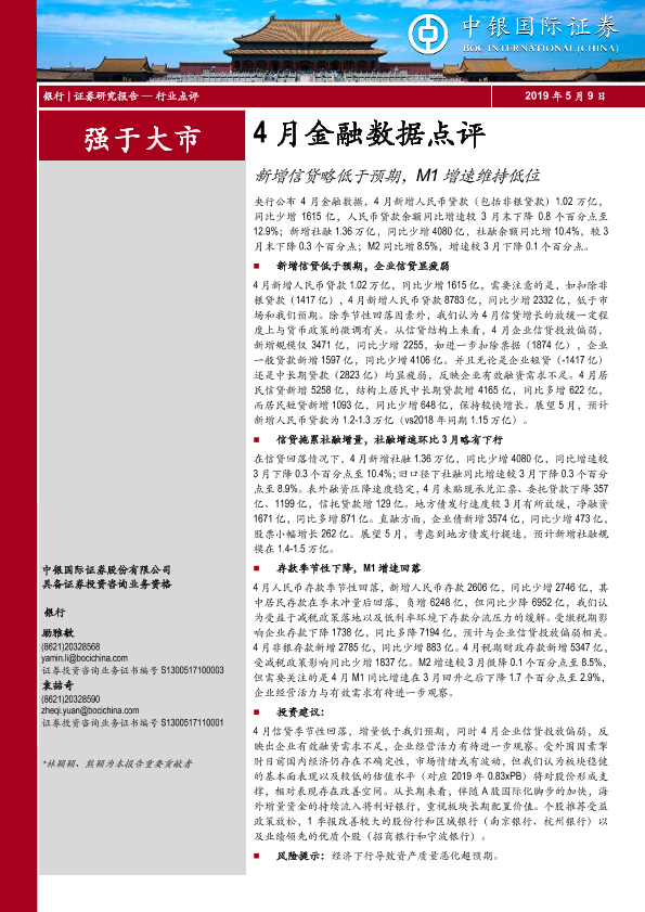 【中银证券】【20190509】4月金融数据点评:新增信贷略低于预期,M1增速维持低位-6页