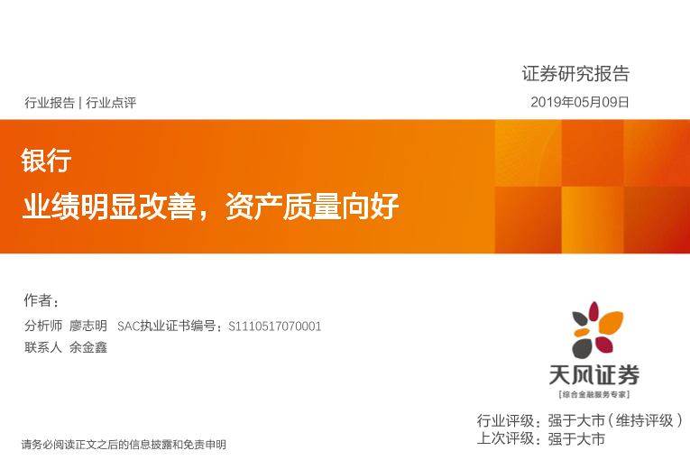 【天风证券】【20190509】银行行业点评:业绩明显改善,资产质量向好-36页