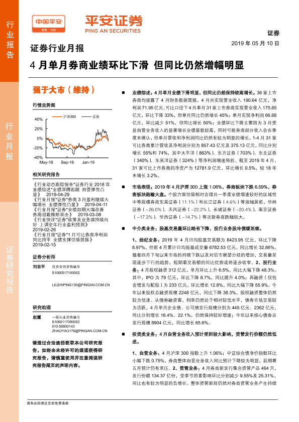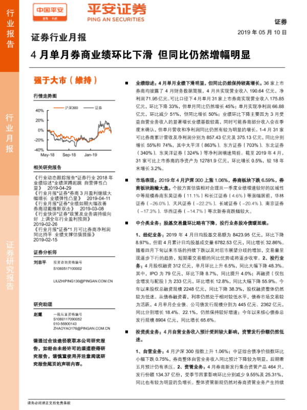 【平安证券】【20190510】证券行业月报:4月单月券商业绩环比下滑 但同比仍然增幅明显-11页