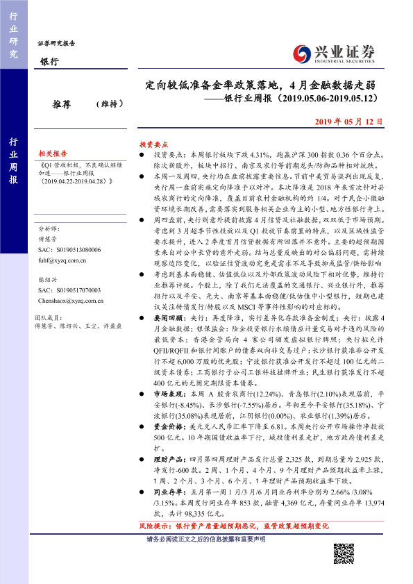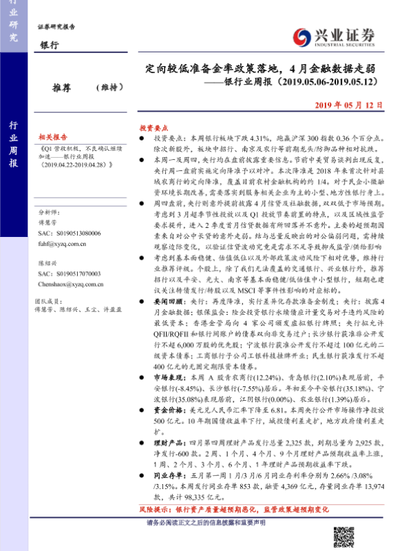 【兴业证券】【20190512】定向较低准备金率政策落地,4月金融数据走弱-12页