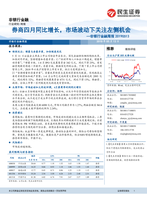 【民生证券】【20190513】非银行金融周报:券商四月同比增长,市场波动下关注左侧机会-10页
