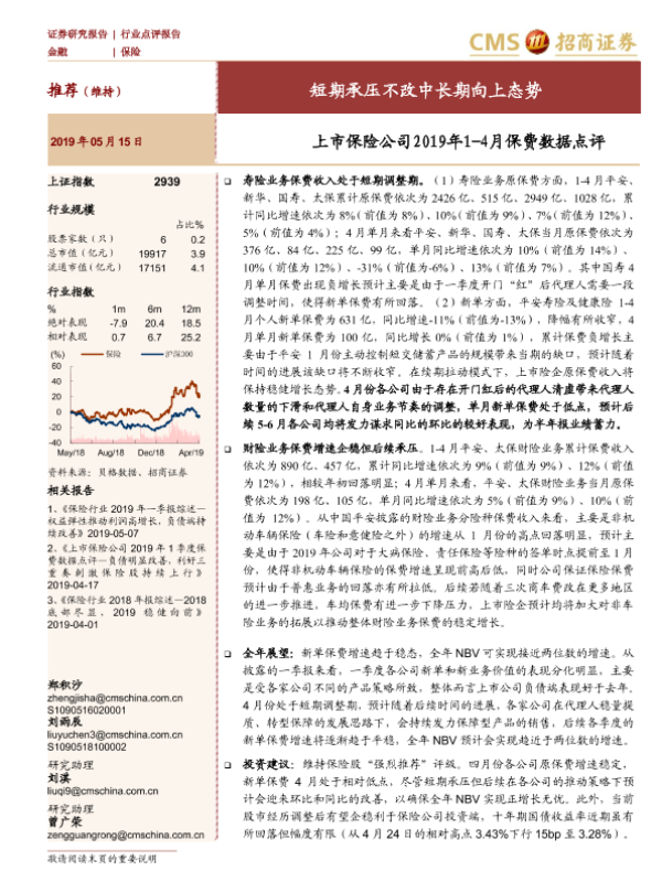 【海通证券】【20190515】上市保险公司2019年1-4月保费数据点评:短期承压不改中长期向上态势-5页