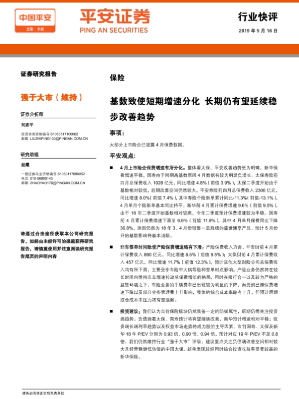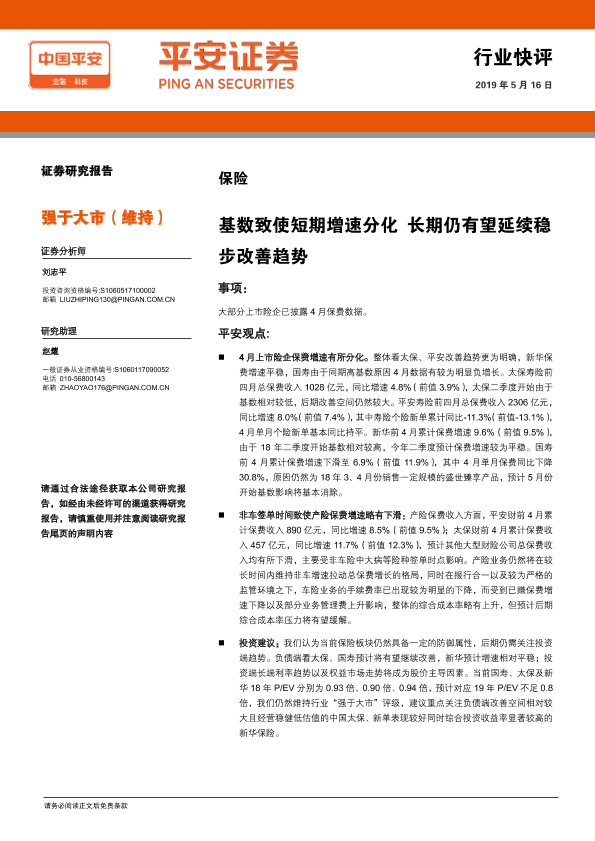 【平安证券】【20190516】保险行业快评:基数致使短期增速分化 长期仍有望延续稳步改善趋势-4页