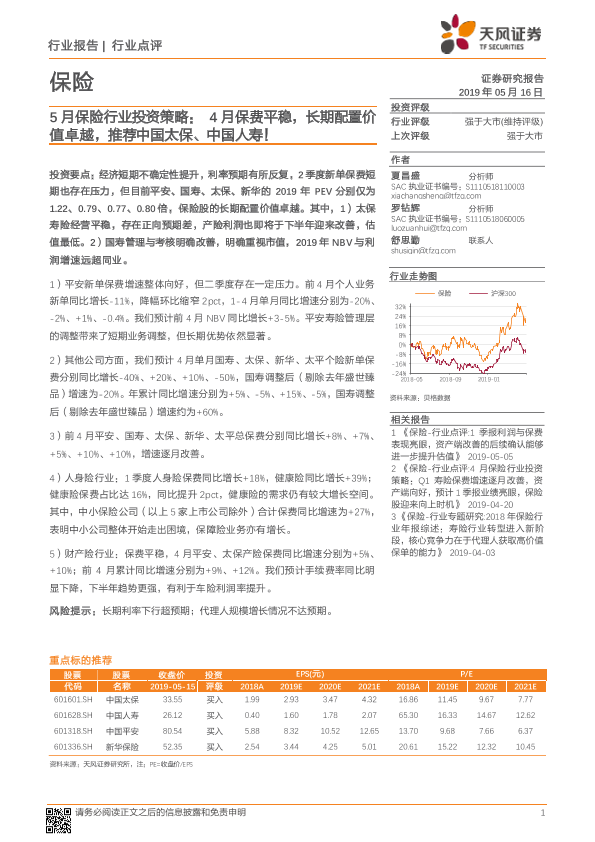 【天风证券】【20190516】5月保险行业投资策略:4月保费平稳,长期配置价值卓越-7页