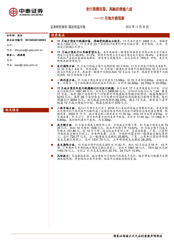 【中泰证券】【20221130】11月地方债观察:发行规模回落,再融资债逾八成-15页
