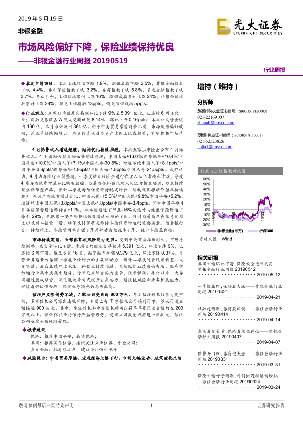 【光大证券】【20190519】非银金融行业周报:市场风险偏好下降,保险业绩保持优良-15页