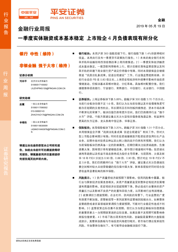 【平安证券】【20190519】一季度实体融资成本基本稳定 上市险企4月负债表现有所分化-5页