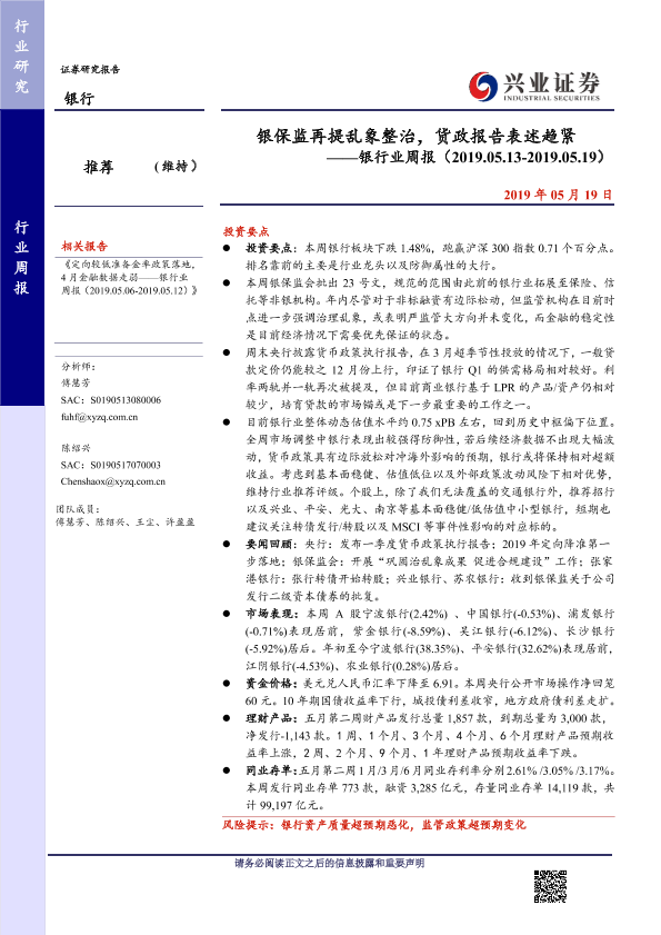 【兴业证券】【20190519】银保监再提乱象整治,货政报告表述趋紧-12页