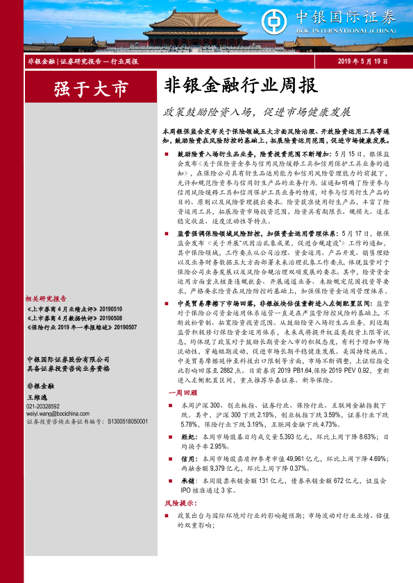 【中银证券】【20190519】非银金融行业周报:政策鼓励险资入场,促进市场健康发展-14页